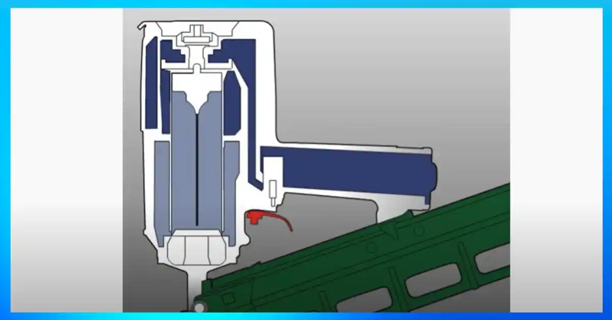 It uses a trigger mechanism that controls the flow of air over a piston, which propels the nail. When you pull the trigger, air flows past a valve and allows the piston to move forward.